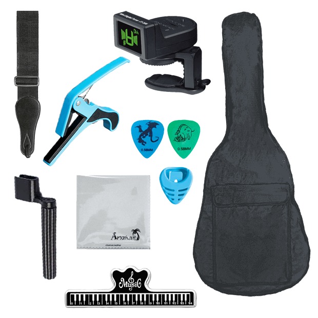 贈送豪禮9件組(琴袋、背帶、調音器、捲弦器、琴布、樂譜夾、移調夾、PICK、PICK盒)