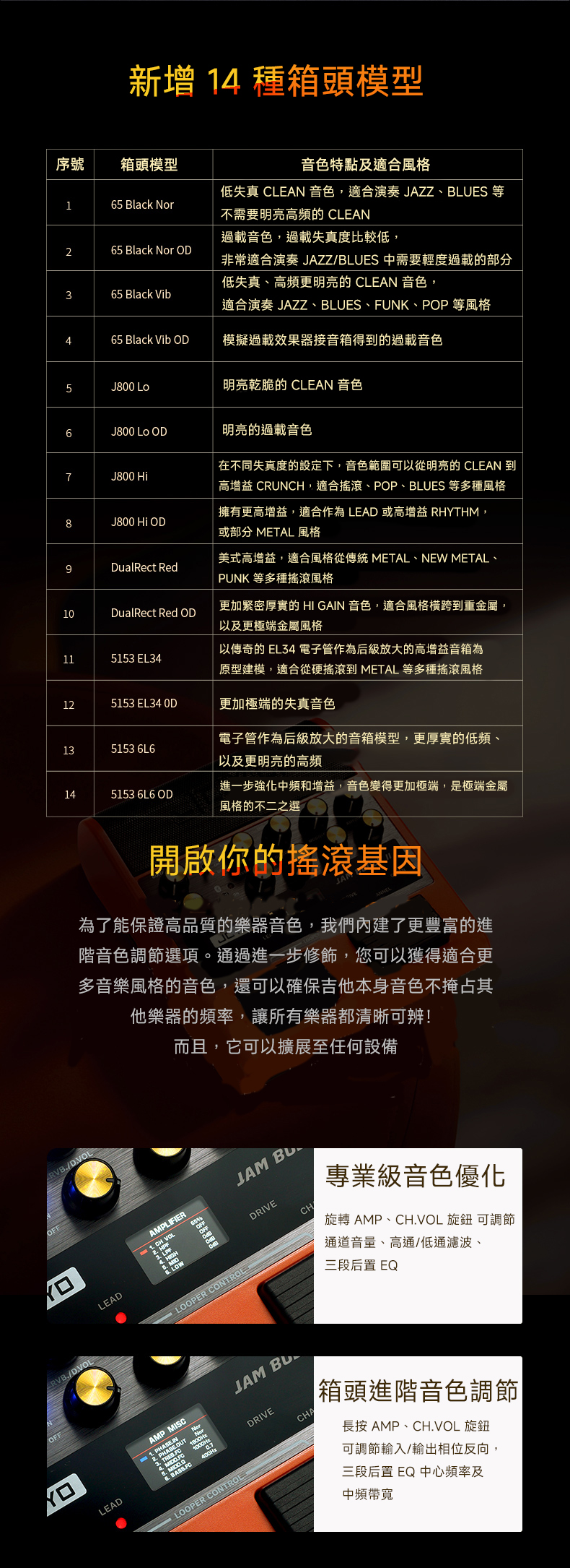 並新增 14 種箱頭模型與九種效果器模式,涵蓋 CLEAN、BLUES、FUNK、ROCK 到 METAL,