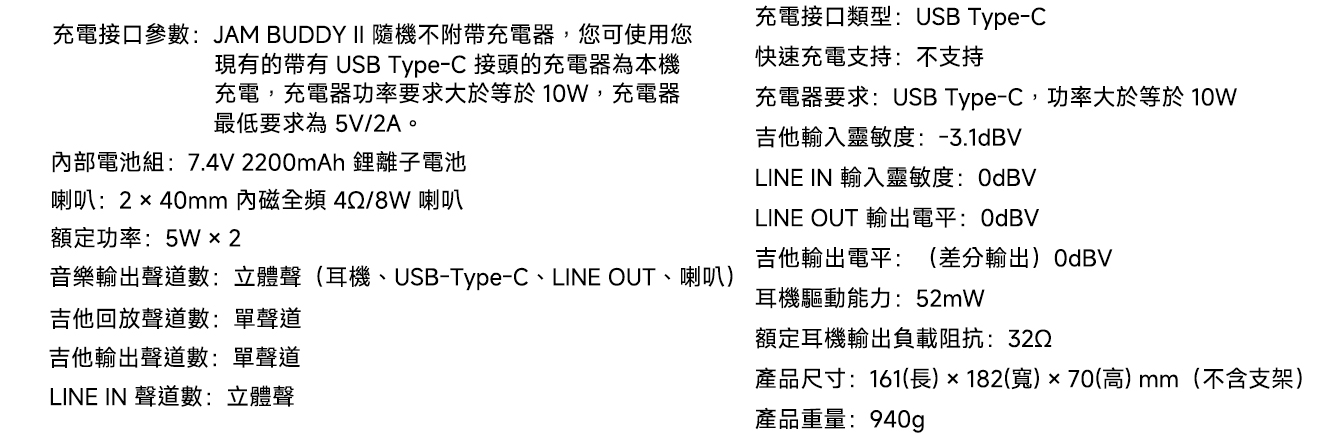 充電接口參數:JAM BUDDY II 隨機不附帶充電器,您可使用您